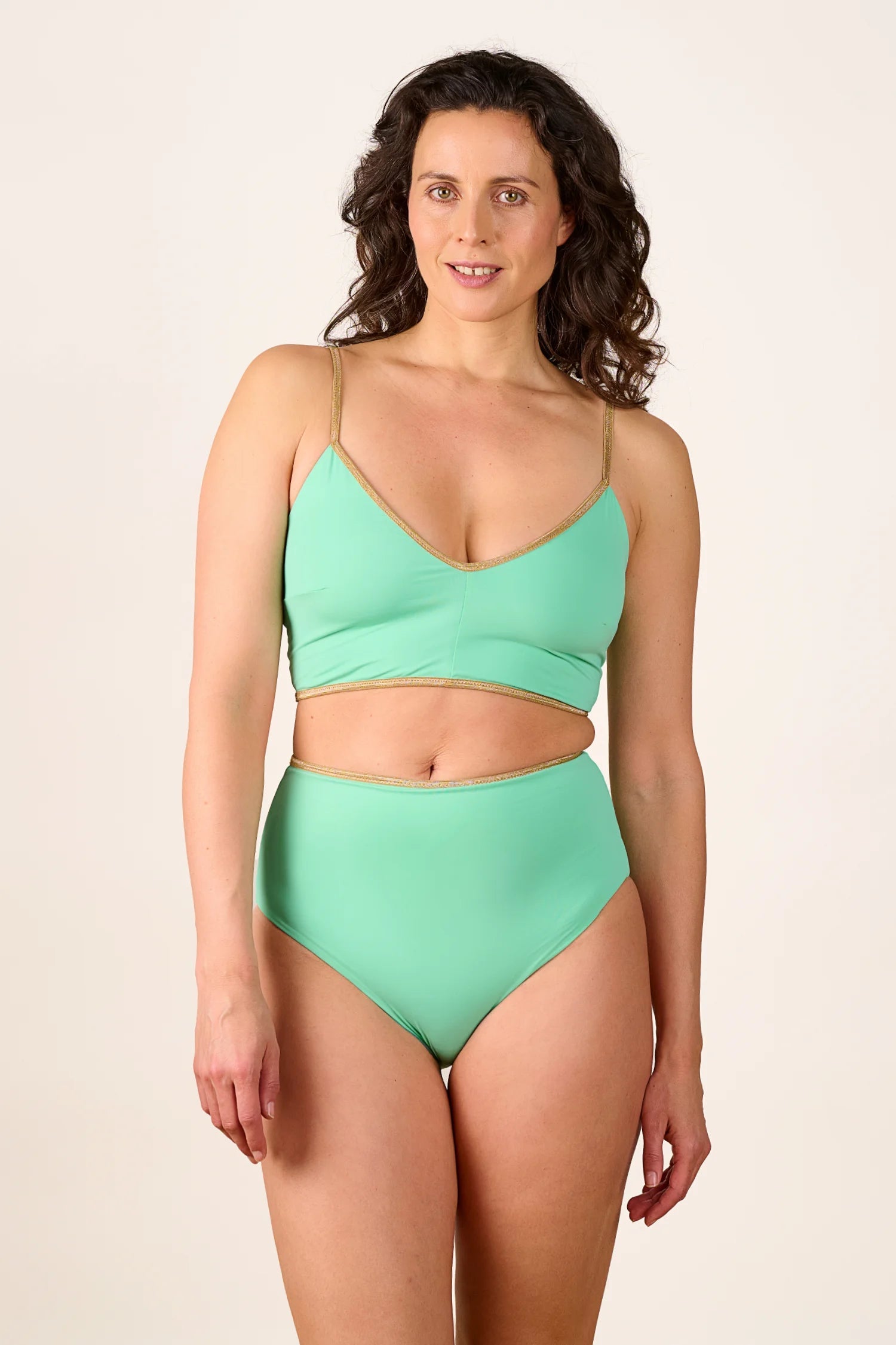 The new VACATION TOP SHINE is inspired by our popular VACATIONBODY one-piece. Set off by a V-neck and delicate golden straps, the longer bralette-style length provides extra coverage and added support, while the golden SHINE band elegantly accents the hem and neckline. A versatile and elegant top that shines both in the water and as a chic summer top.