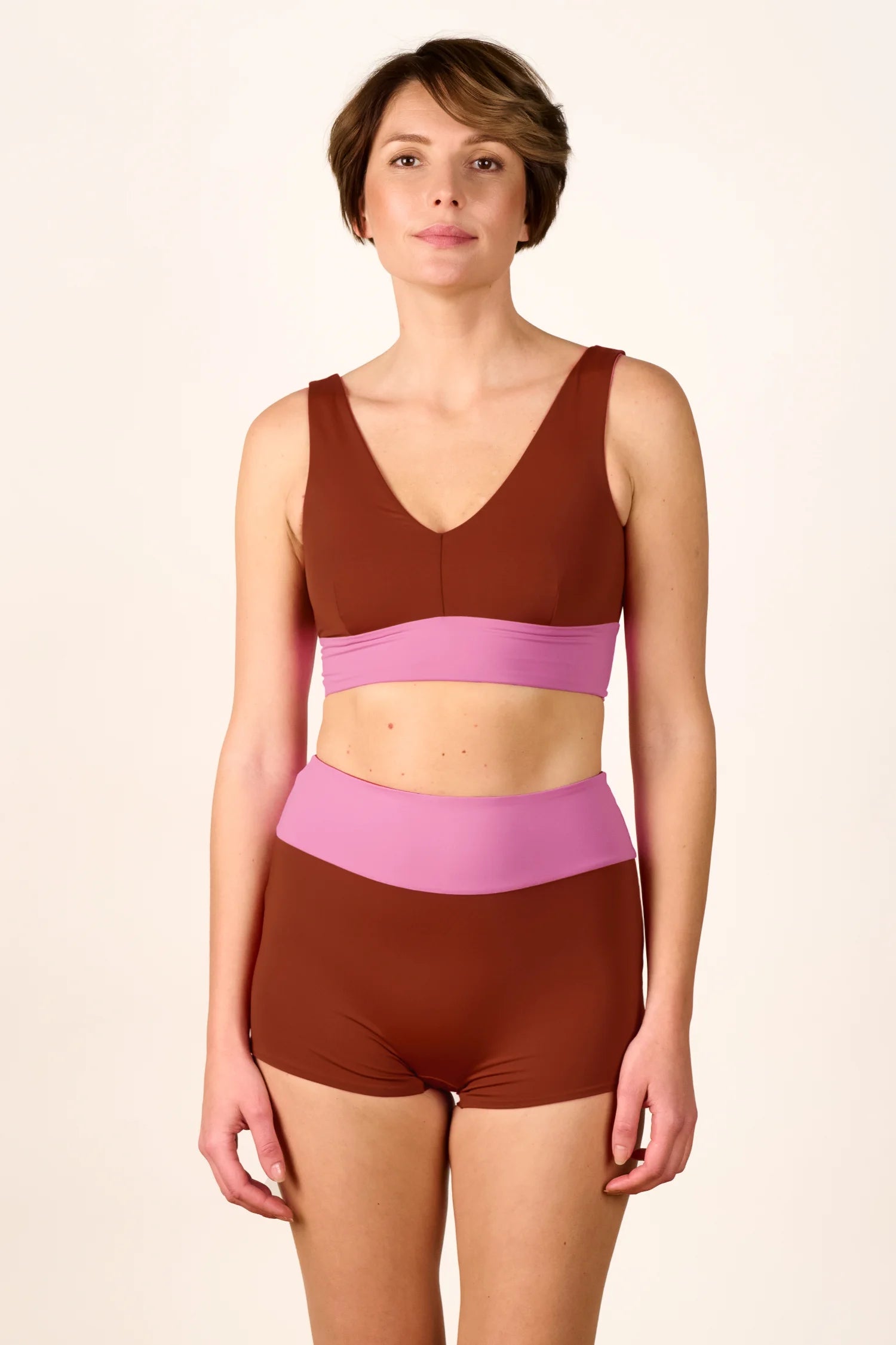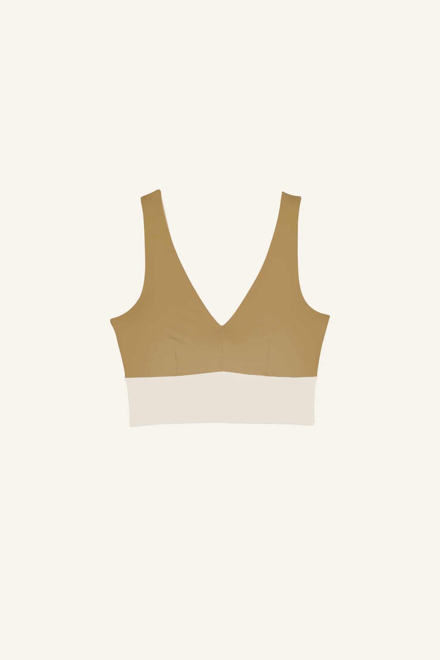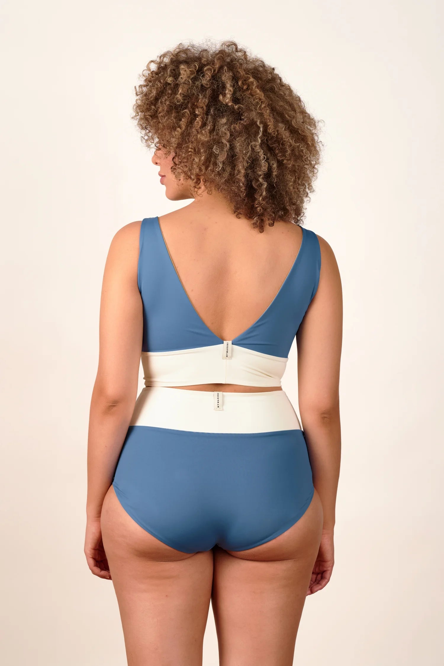 Inspired by a sports top, the YOGA TOP is the perfect companion for any summer activity. Designed for comfort and support, it stays put whether you're swimming, surfing, or doing yoga. The wide, color-contrasting underbust band ensures a secure fit, while the V-neck at the front and the deep plunging back add an elegant touch.