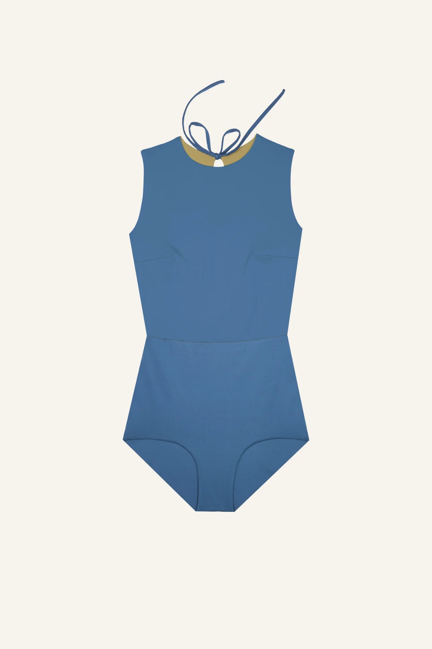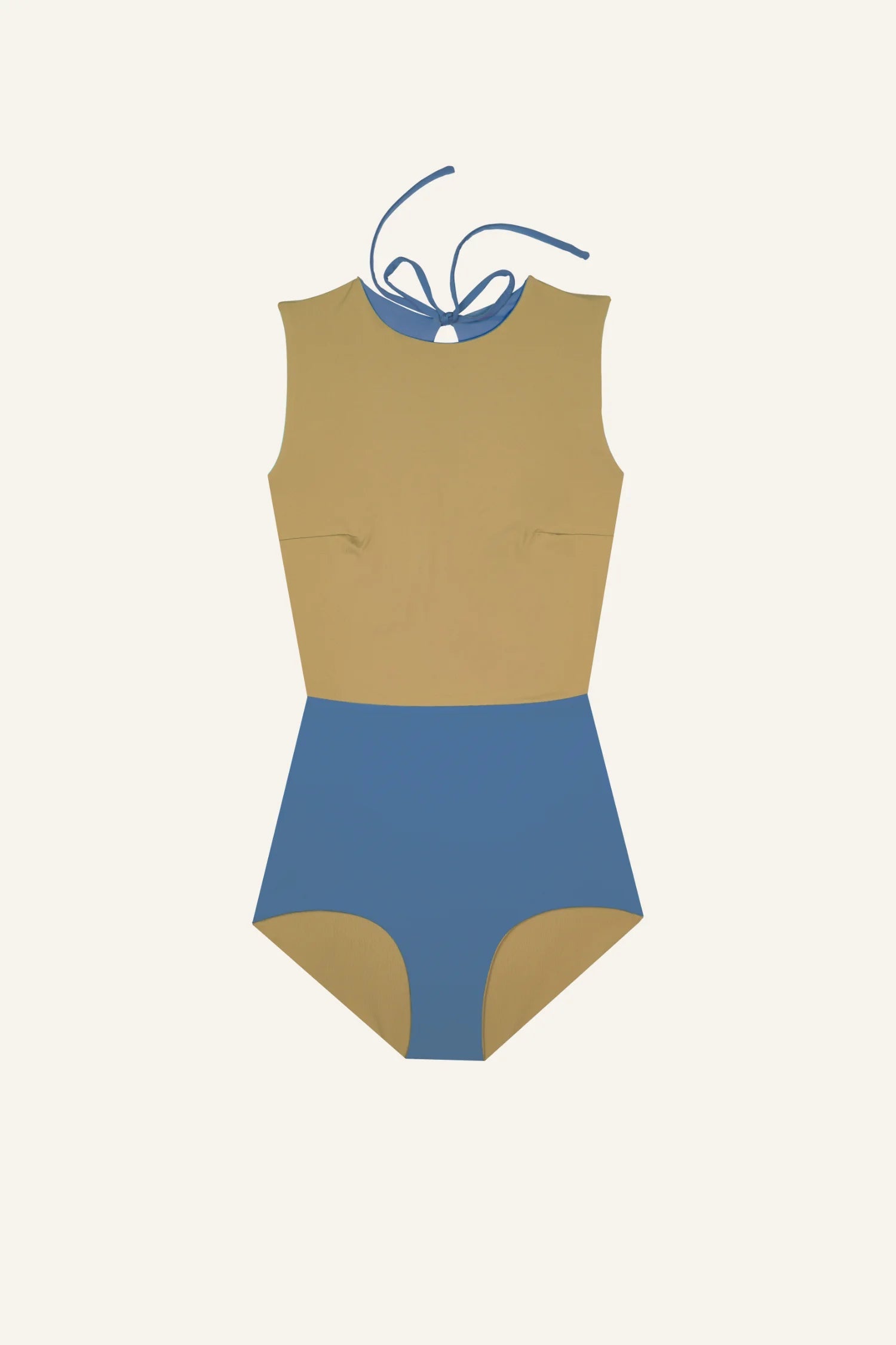 The OUTFIT-ONEPIECE is an elegant and sporty swimsuit that combines functionality with style. It has a high neckline and deep keyhole cutout at the back, tied with a slim ribbon. With seamed shaping at the waistline for a soft hourglass silhouette.